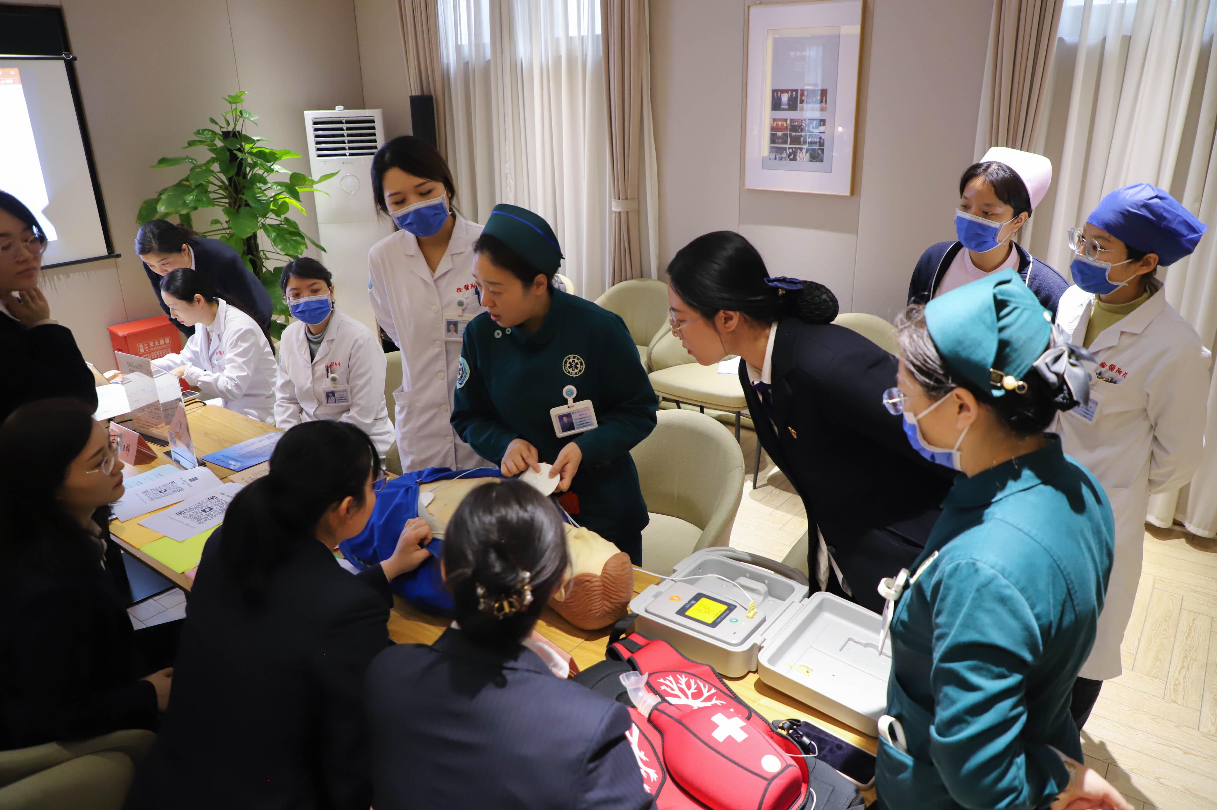 “心脏骤停发生后,每延迟1分钟,生存率下降7%-10%,黄金抢救时间只有4分钟。”活动现场,徐华围绕职场突发状况的应急处理,开展急救知识专题讲座,将心肺复苏、AED使用、海姆立克急救法三大急救技能融为一体进行系统讲解。